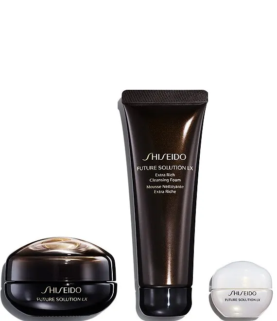 Treat and replenish the delicate eye and lip areas with this curated gift set of Future Solution LX favorites. The full-sized Future Solution LX Eye and Lip Contour Regenerating Cream nourishes skin and diminishes the appearance of fine lines, puffiness, and dark circles. This set also include deluxe-sized samples of Future Solution LX Extra Rich Cleansing Foam to gently remove impurities while hydrating skin, and Future Solution LX Total Protective Cream SPF 20 to refine texture and protect from UV rays, dryness, and oxidation.