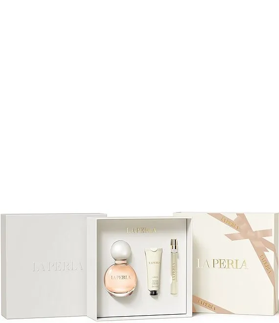 A three-piece set featuring La Perla's Luminous full-size fragrance, its refillable purse spray, and a protecting hand cream. The set is plastic-free and printed on sustainably sourced paper.