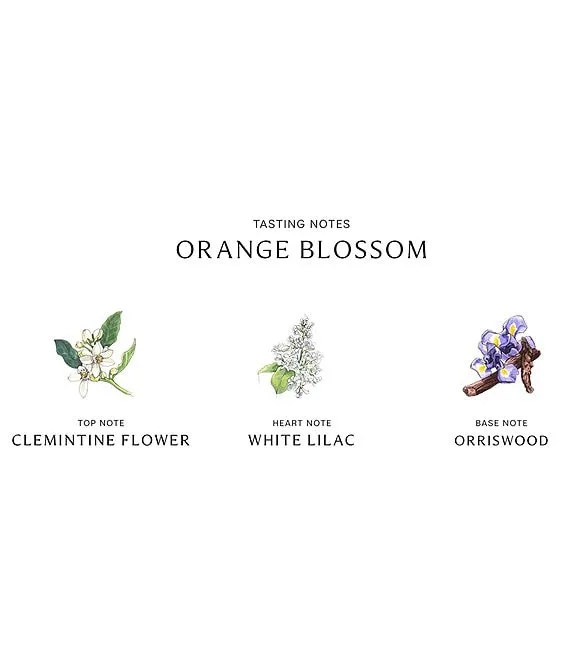 The combination of Orange Blossom with English Pear & Freesia creates a blooming floral bouquet, luminous with shimmering orange blossom and fresh freesias.