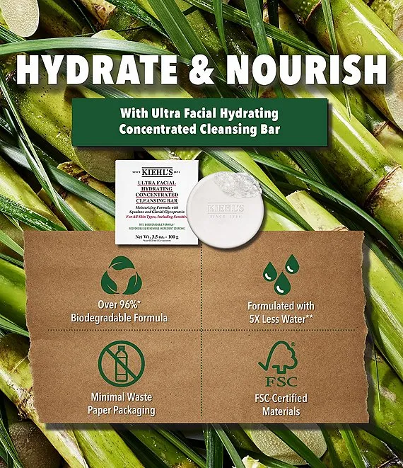 Gently cleanse and moisturize skin with our mild hydrating facial cleaning bar. Enriched with 2x more renewable Squalane (versus the Ultra Facial Cleanser) and responsibly sourced Glacial Glycoprotein, this highly concentrated cleanser lathers from a solid cream texture into a nourishing foam to effectively remove impurities without stripping the skin. Formulated to protect the skin's moisture barrier and natural pH levels, this hydrating facial cleansing bar helps skin feel clean and comfortable.