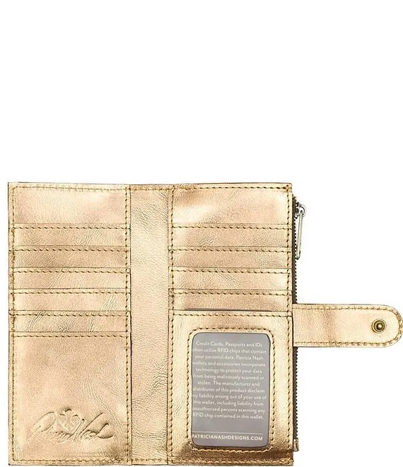 - Interior: 10 credit card slots, 1 ID window, 2 bill pockets, 1 zip coin pocket, deep embossed logo leather trim, nylon lining, faux suede lining, 100% polyester