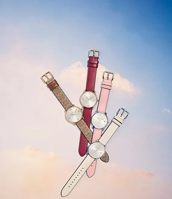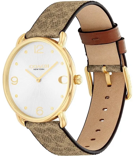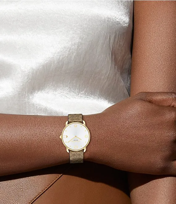 - Gold tone round watch features a white sunray dial detailed with the coach signature marker at 3 o'clock.