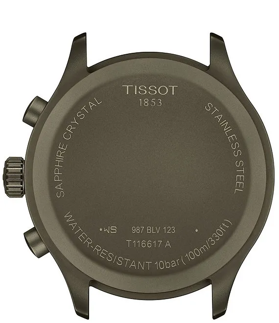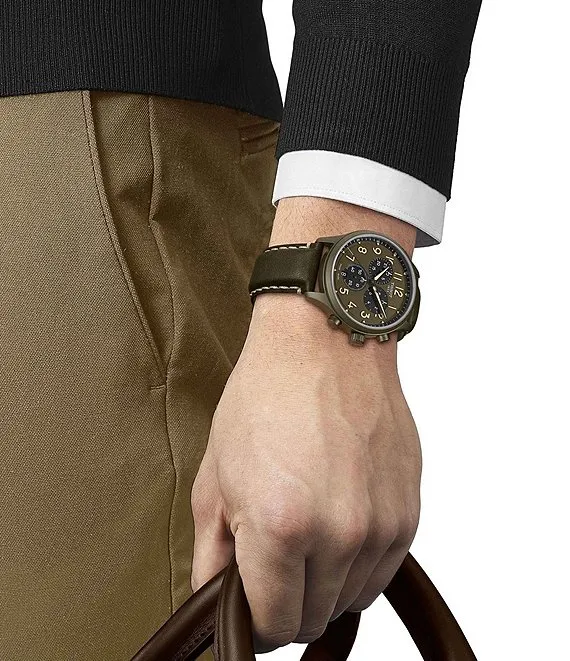 From Tissot, the Men's Chrono XL Quartz Chronograph Khaki Leather Strap Watch features: