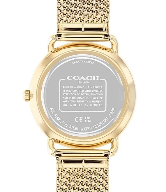 From COACH, the Men's Elliot Quartz Analog Black Dial Gold Mesh Bracelet Watch features:
