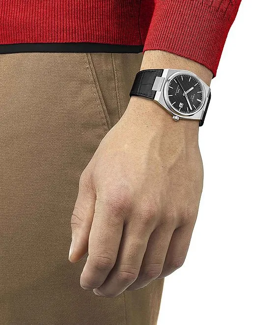 From Tissot, the Men's PRX Classic Collection Automatic Black Leather Strap Watch features: