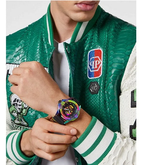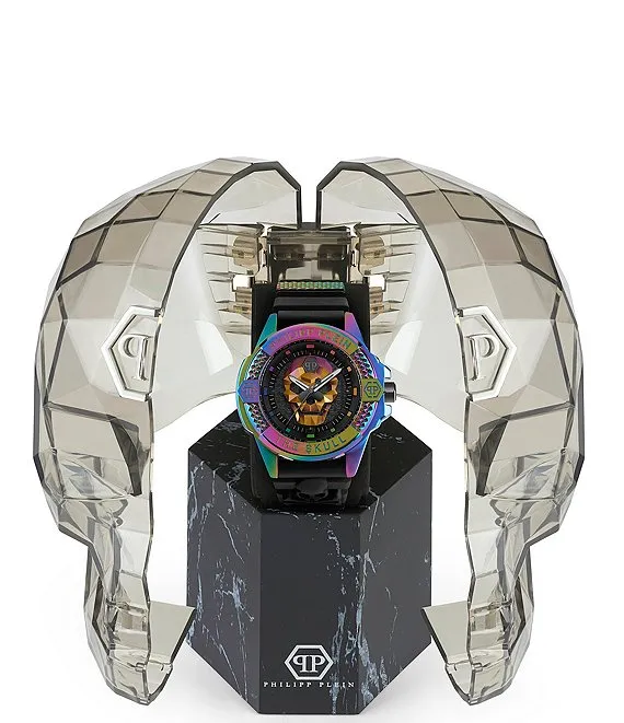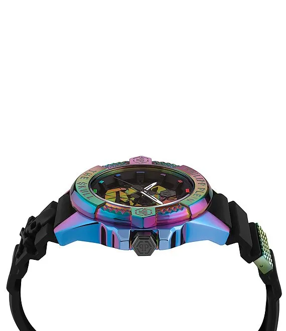From Philipp Plein, the Men's The Skull Rainbow Quartz Analog Black Silicone Strap Watch features:
