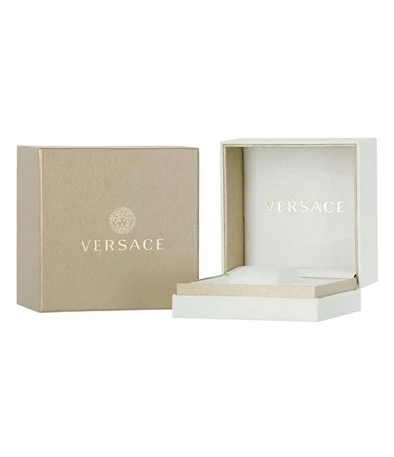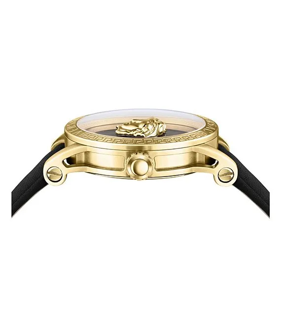 From Versace, the Men's V-Code Quartz Analog Black Leather Strap Watch features: