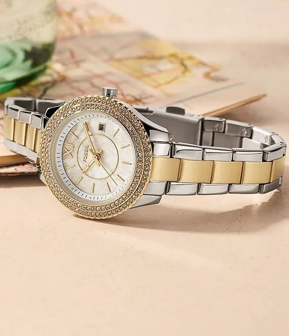 From Fossil, the Stella Three-Hand Date Two-Tone Stainless Steel Watch features:
