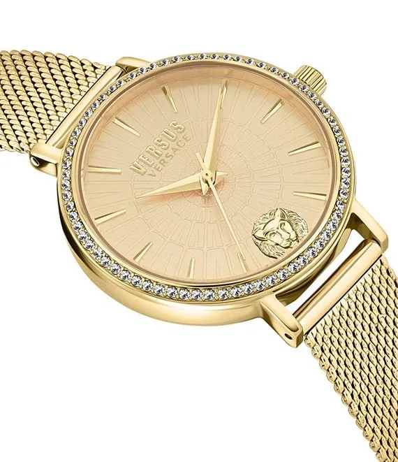 From Versus Versace, the Women's Mar Vista Crystal Analog Gold Stainless Steel Mesh Bracelet Watch features: