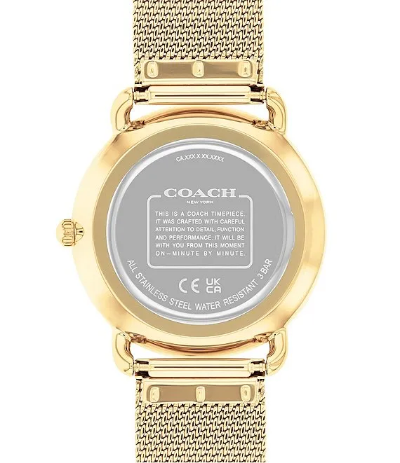 From COACH, the Women's Elliot Quartz Analog Gold Mesh Bracelet Watch features: