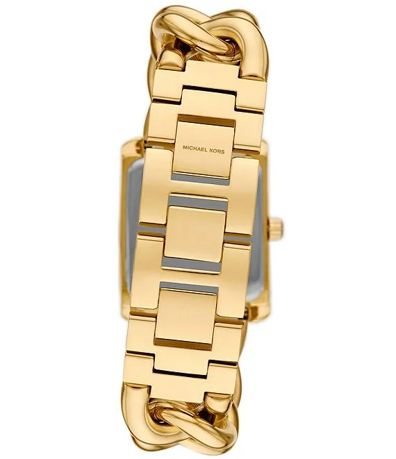 From Michael Kors, the Women's Emery Cheetah Three-Hand Dial Gold Tone Stainless Steel Bracelet Watch features:
