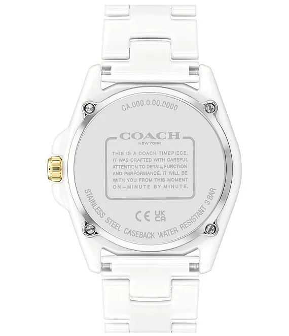 From COACH, the Women's Grayson Analog White Ceramic Bracelet Watch features: