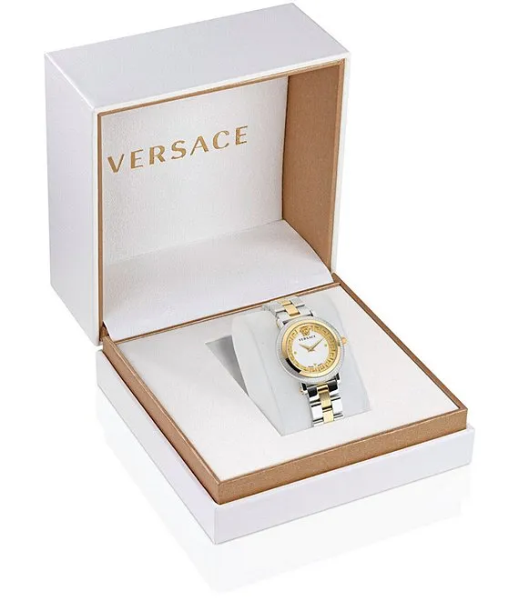 From Versace, the Women's Greca Flourish Quartz Analog Two Tone Stainless Steel Bracelet Watch features: