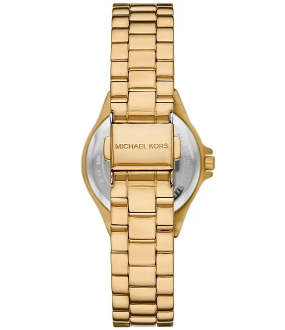 From Michael Kors, the Women's Lennox Three-Hand Gold-Tone Leopard Print Stainless Steel Bracelet Watch features: