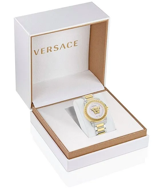 From Versace, the Women's Medusa Deco Quartz Analog Two Tone Stainless Steel Bracelet Watch features: