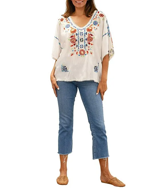 Embroidered V-Neck Short Sleeve Printed Back Blouse