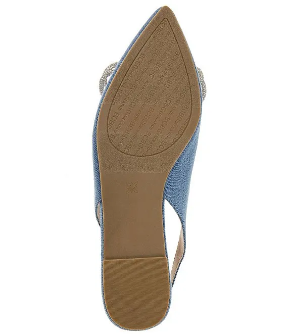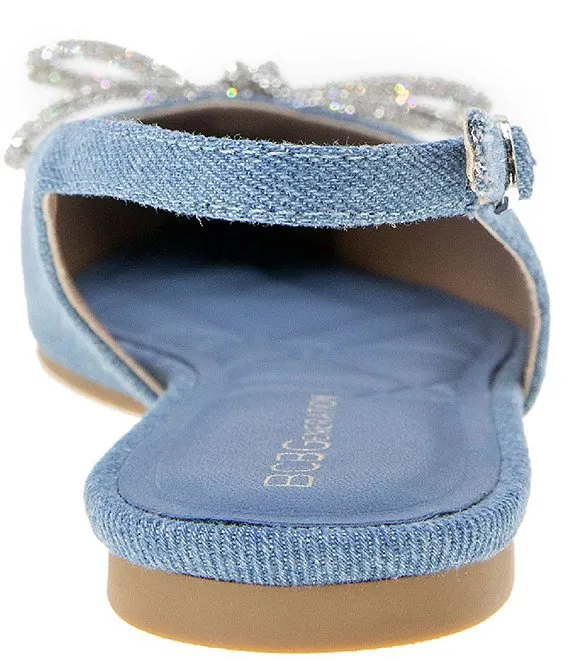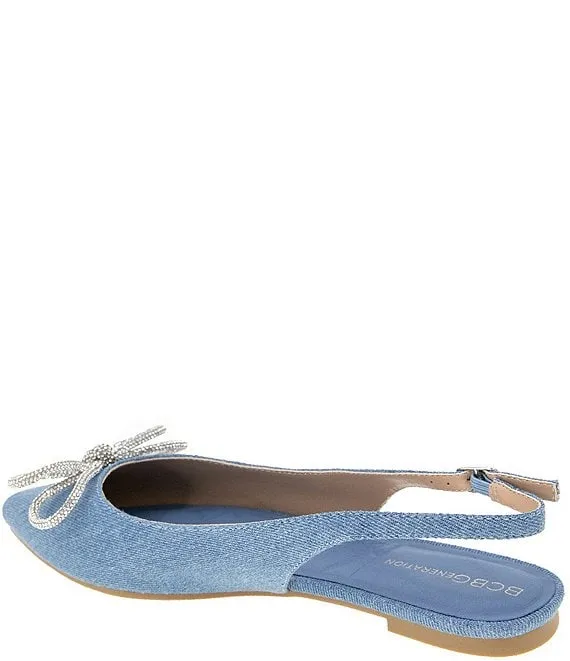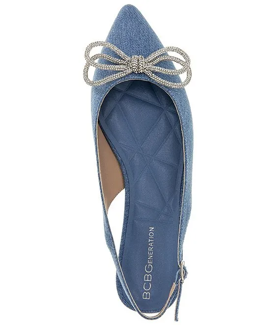 From BCBGeneration, the Kristin Denim Rhinestone Bow Slingback Ballet Flats feature: