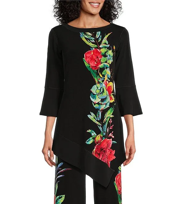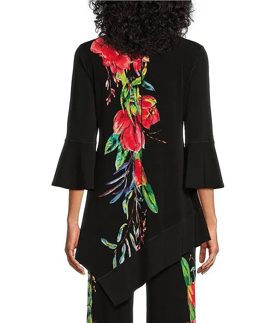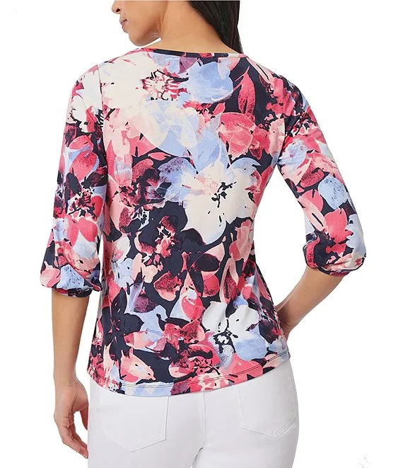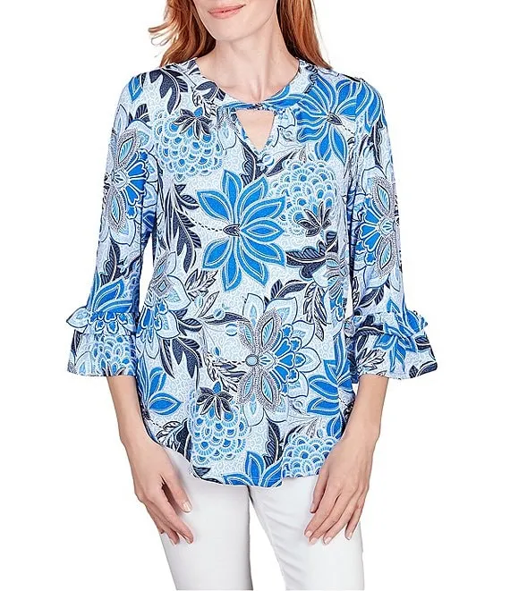 Floral Print Knit Keyhole Twist Neck 3/4 Double Flounce Sleeve Top