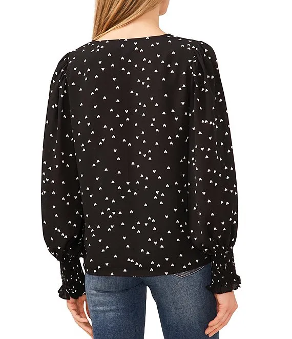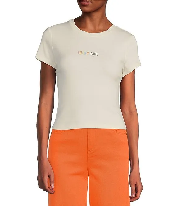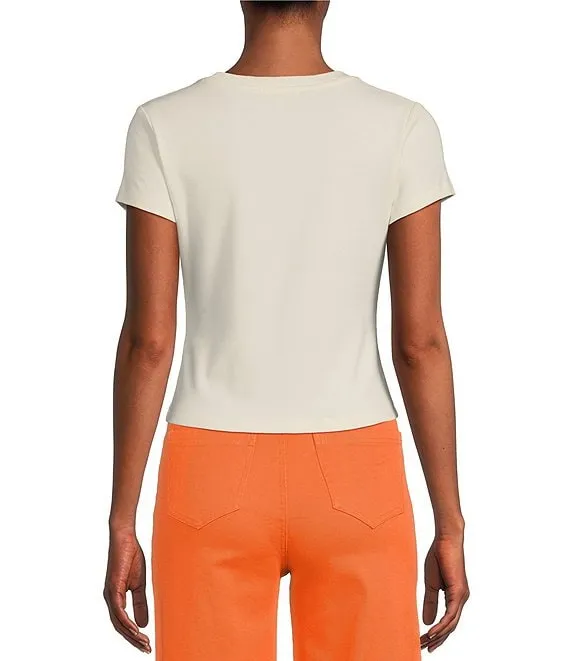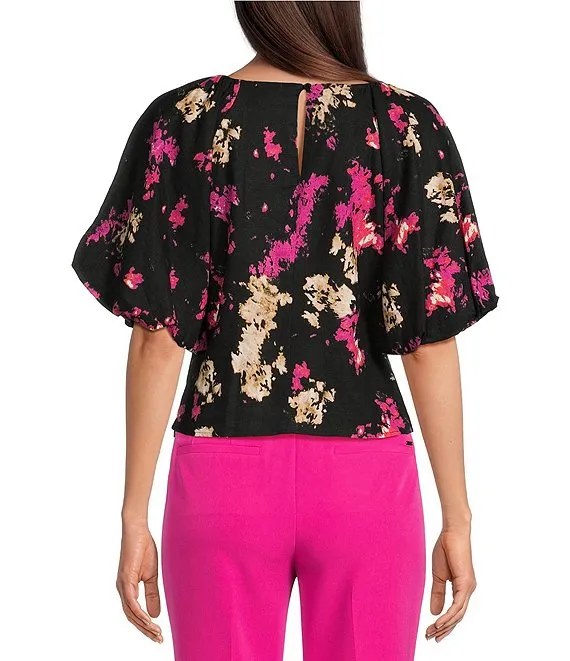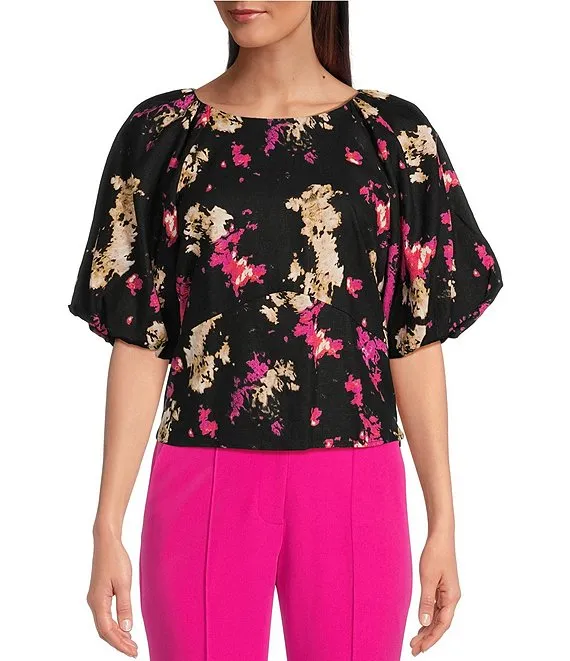 Printed Linen Crew Neck Short Puff Sleeve Top