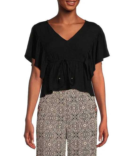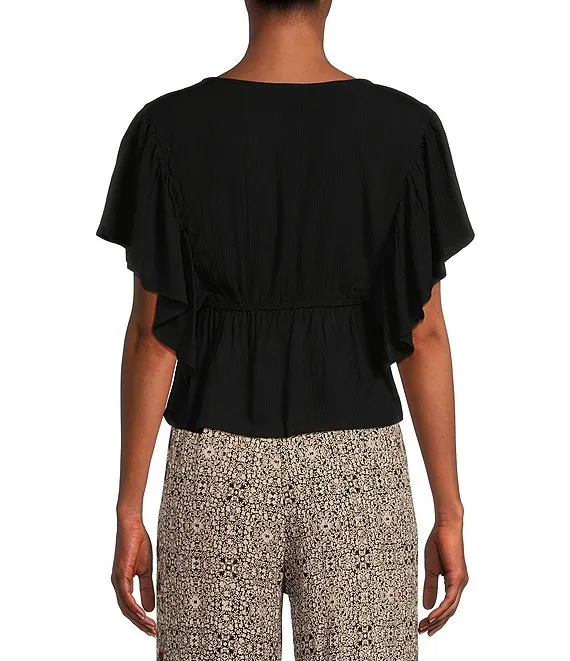 V-Neck Flutter Sleeve Tie Front Top