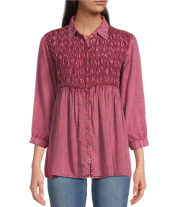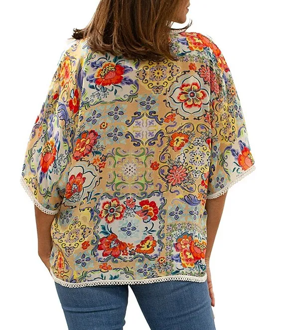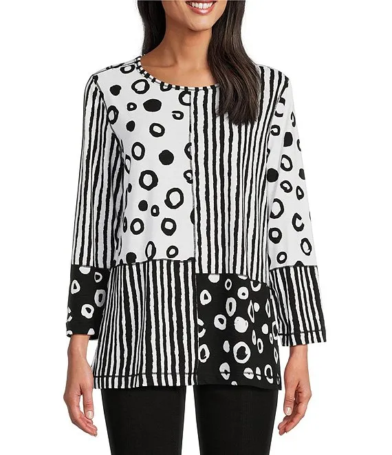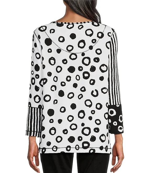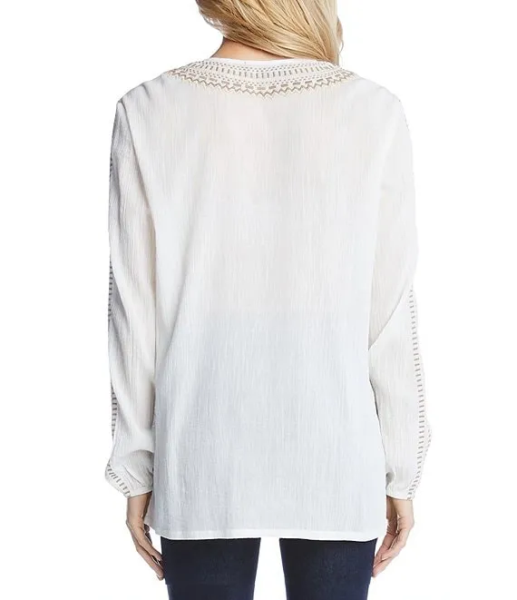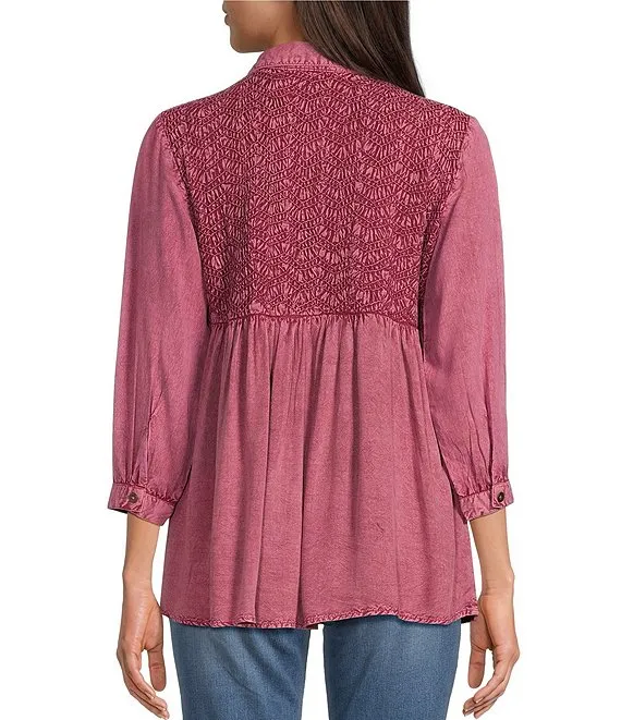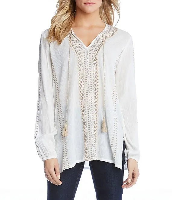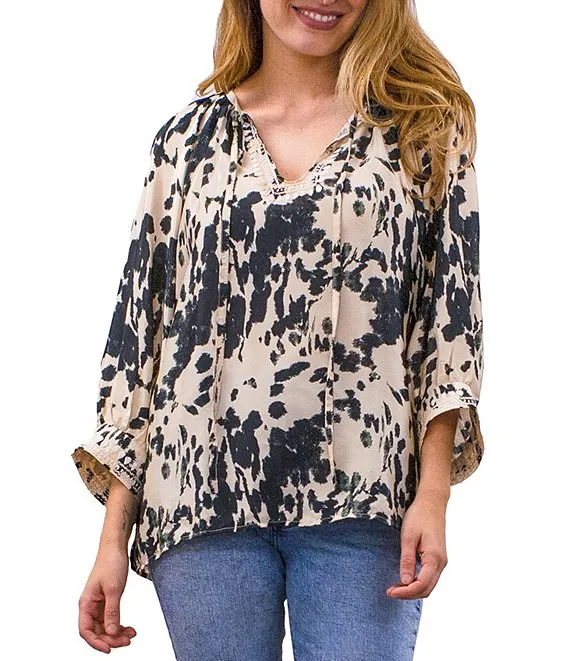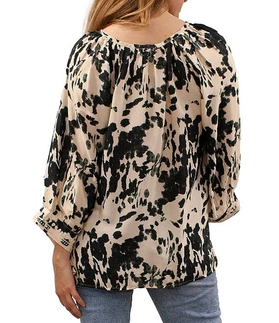Woven Mabel Abstract Print Split V-Neck 3/4 Sleeve Tassel Tie Embroidered Blouse