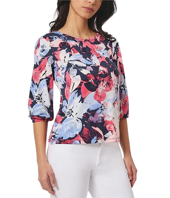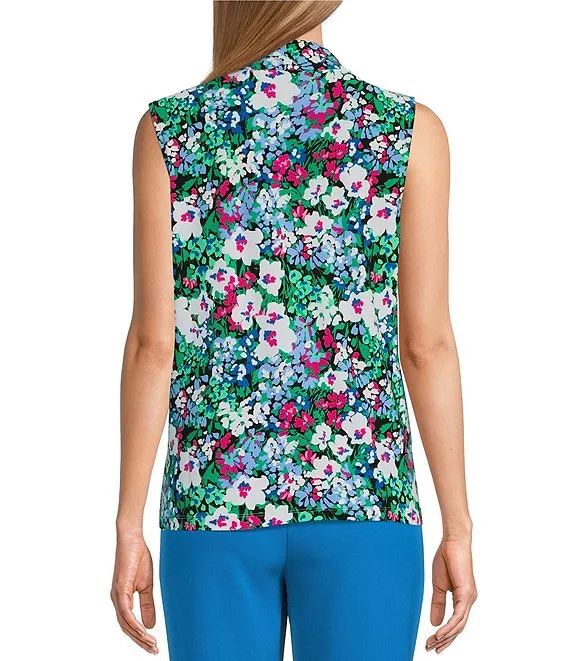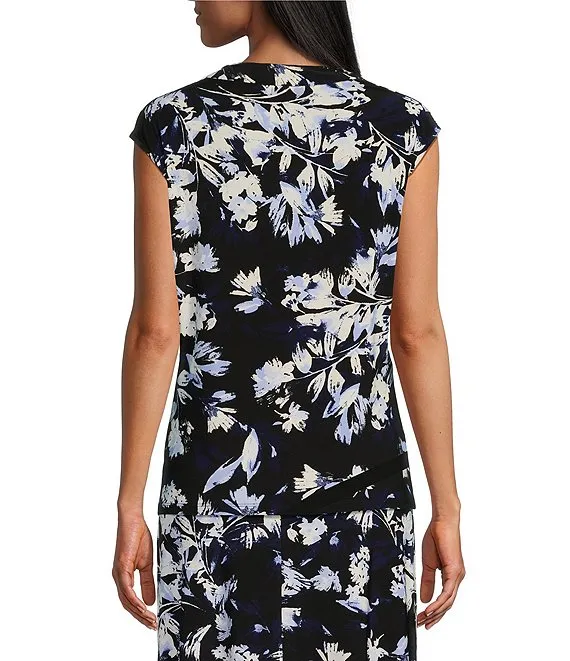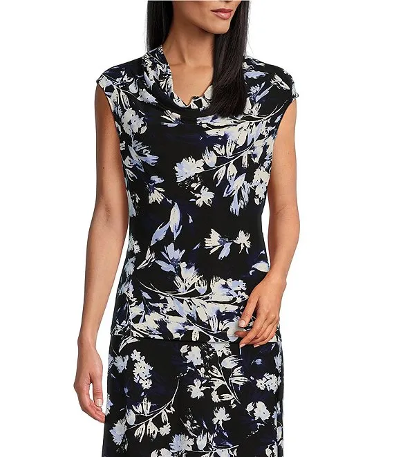 Kasper Stretch Crepe Floral Print Cowl Neck Cap Sleeve Top