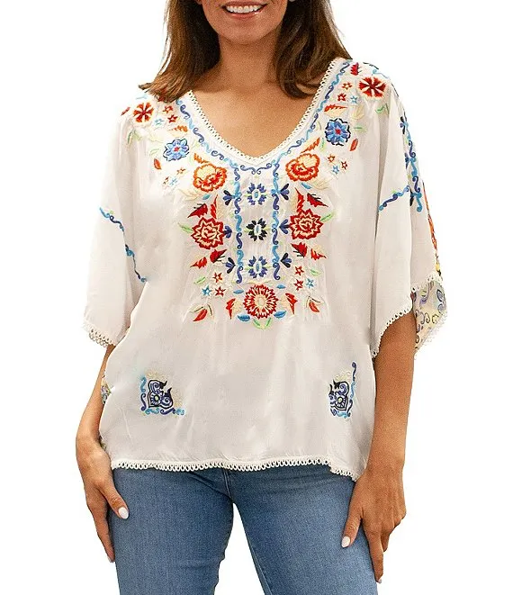 Embroidered V-Neck Short Sleeve Printed Back Blouse