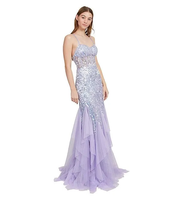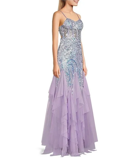 3D Sequin Sweetheart Neck Spaghetti Strap Mesh Corset Bodice Open Back Mermaid Gown