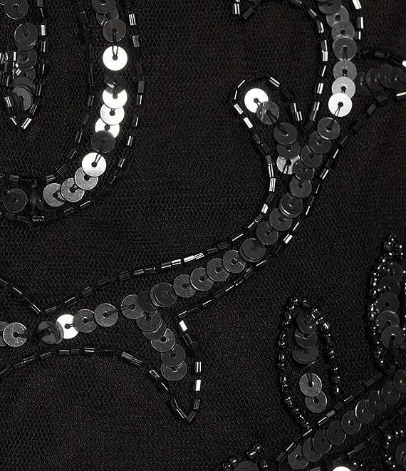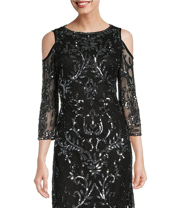 Beaded Sequin Crew Neck Cold Shoulder 3/4 Sleeve Gown