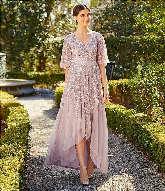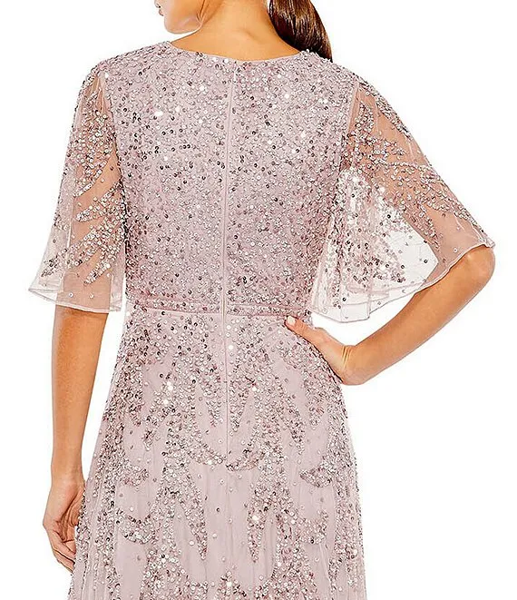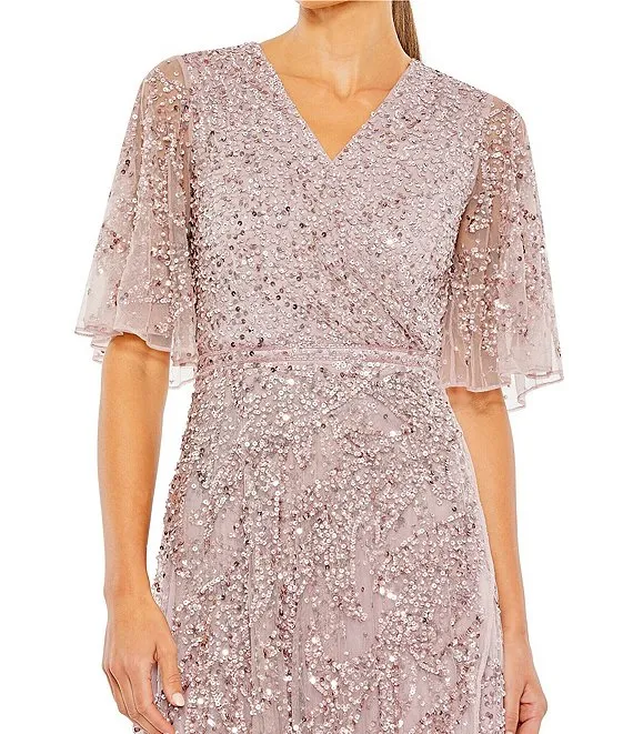 Mac Duggal Beaded Short Flutter Sleeve Surplice V-Neck High-Low Faux Wrap Gown