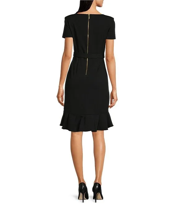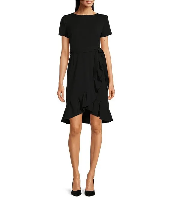 Calvin Klein Boat Neck Short Sleeve Belted Ruffle Hem Faux Wrap Dress