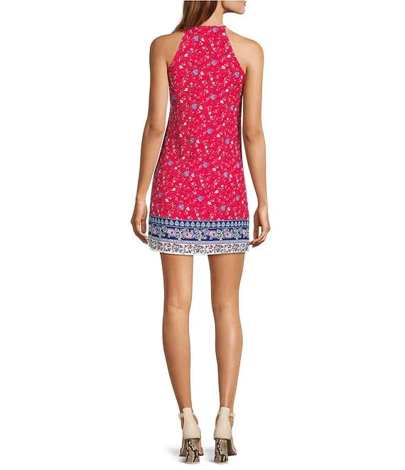 Border Floral Print Halter Split-Neck Sleeveless Shift Dress
