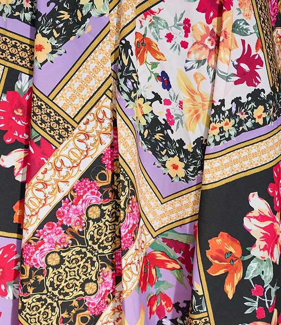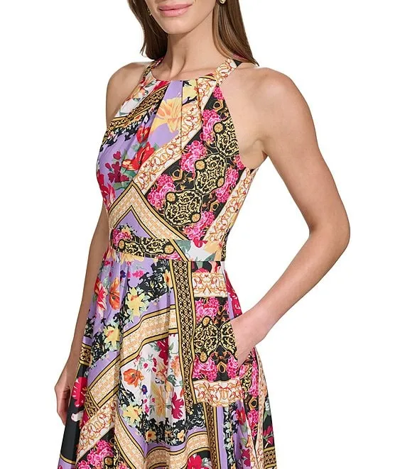 Crepe de Chine Floral Scarf Print Halter Neck Sleeveless Handkerchief Hem A-Line Midi Dress