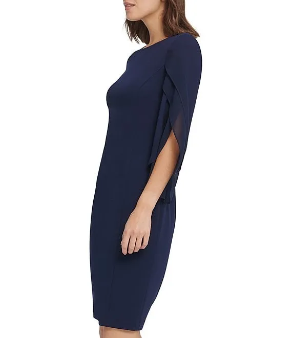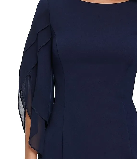 Crew Neck Chiffon 3/4 Tulip Sleeve Scuba Crepe Sheath Dress