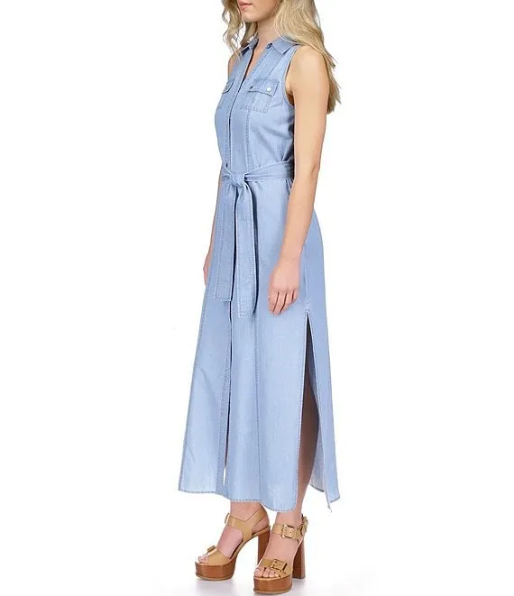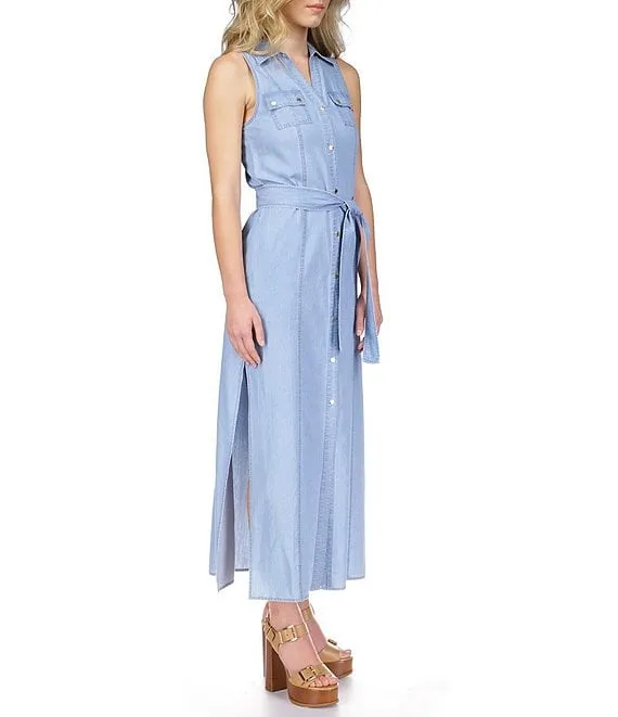 Denim Collared Neck Sleeveless Maxi Shirt Dress