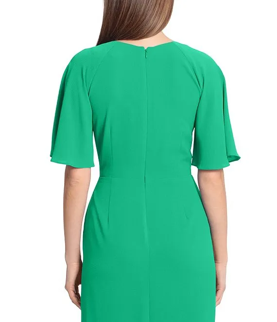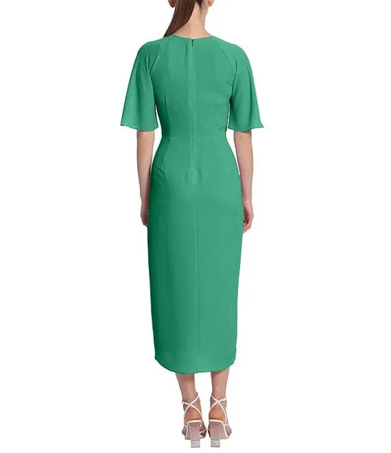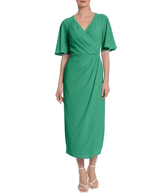 Draped Faux Wrap Short Flutter Sleeve Surplice V-Neck Pebble Crepe Midi Dress