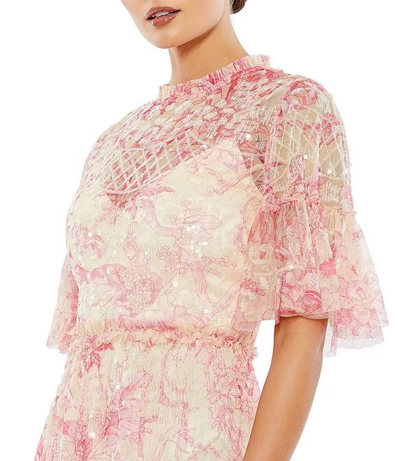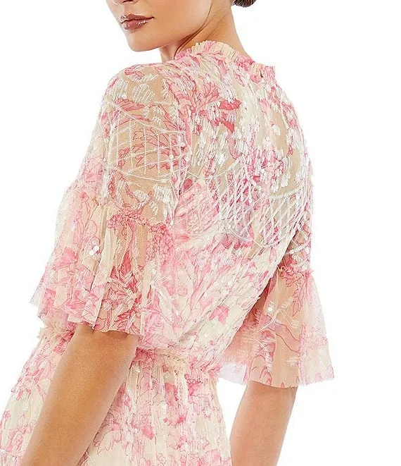 Mac Duggal Floral Print Mock Neck Short Flounce Sleeve Sequin Embellished Tiered Ruffle Hem Dress