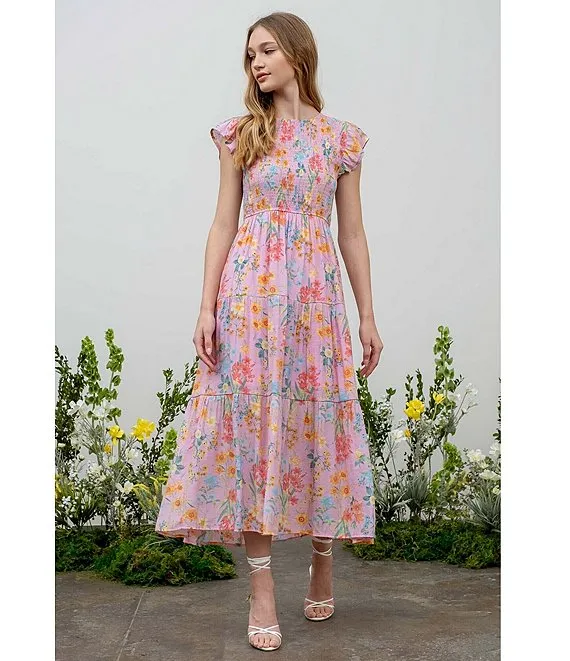Floral Print Smocked Bodice Midi Dress