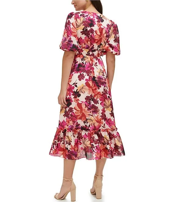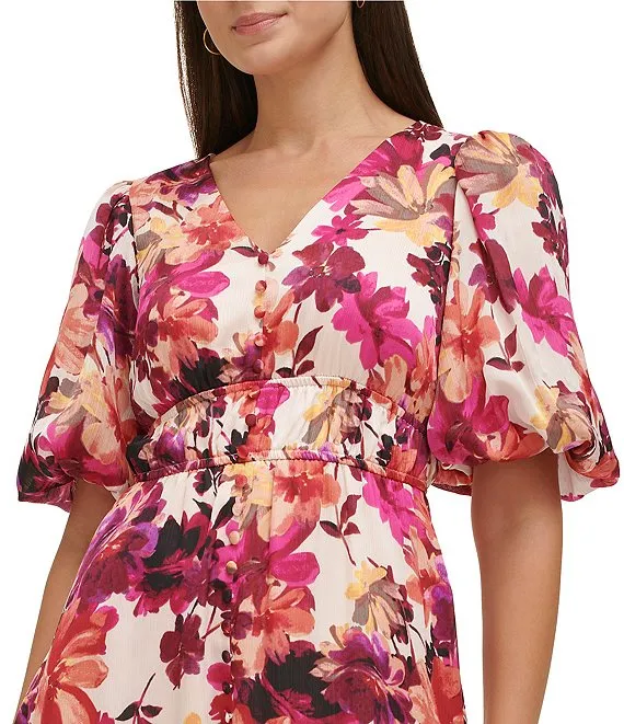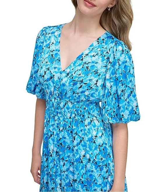 Floral Print V-Neck Short Puffed Sleeve Flounce Hem Maxi Dress