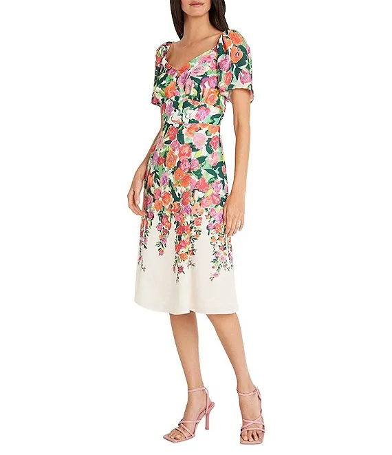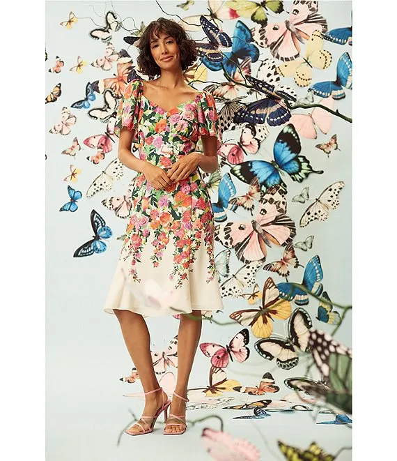 Floral Sweetheart Neck Short Flutter Sleeve Midi Dress