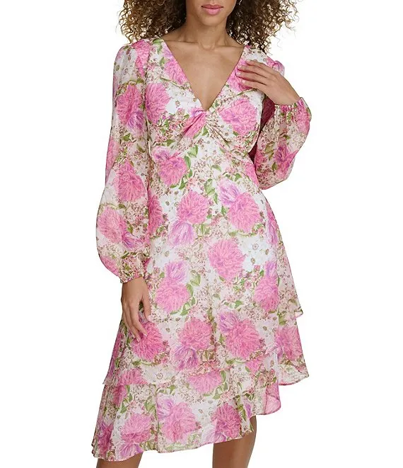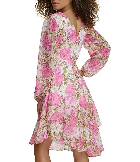 Floral V Neckline Long Sleeve Smocked Waist Asymmetrical Tiered Dress