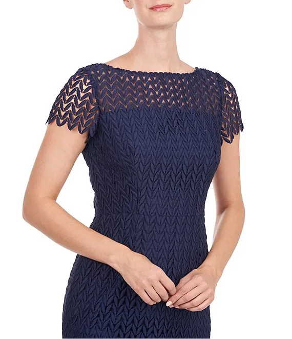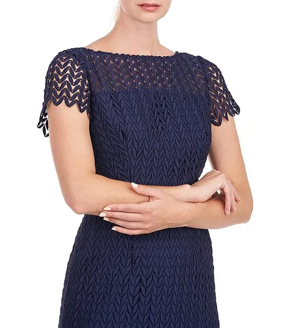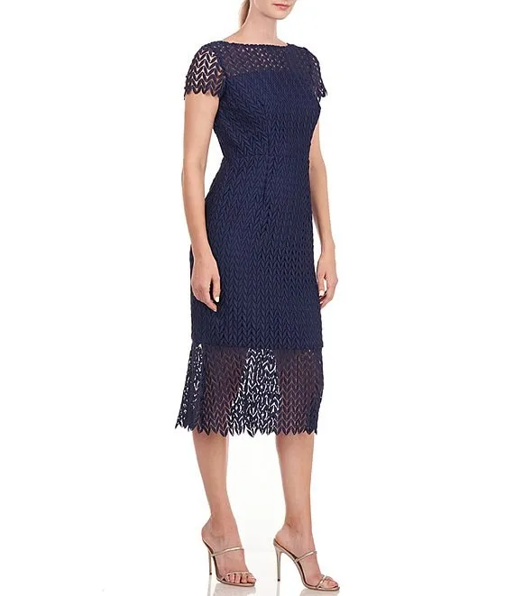 Flounce Hem Illusion Lace Short Sleeve Boat Neck Scalloped Midi Sheath Dress