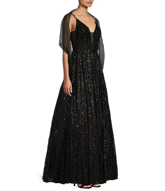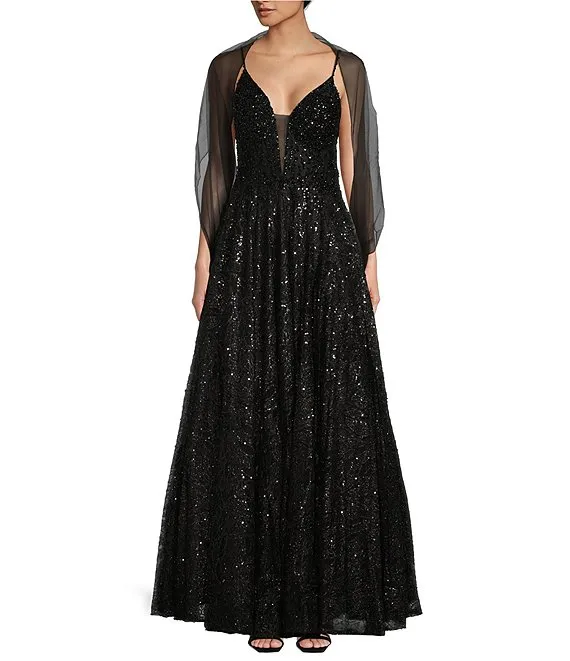 Glitter Mesh Deep V-Neck Low Back Ball Gown
