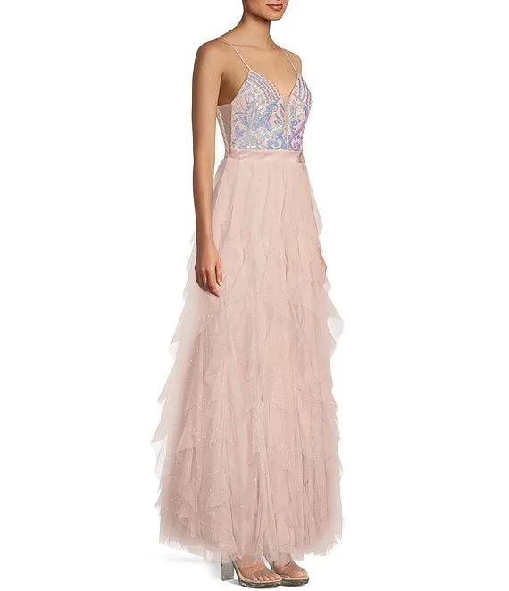 Glitter Sequin V-Neck Mesh Corkscrew Ball Gown