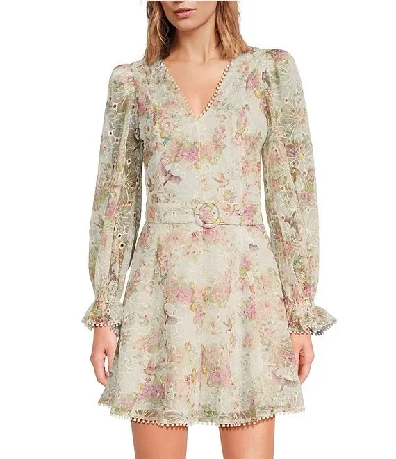Haisley Floral Print V Neck Long Sleeve Belted Mini Dress