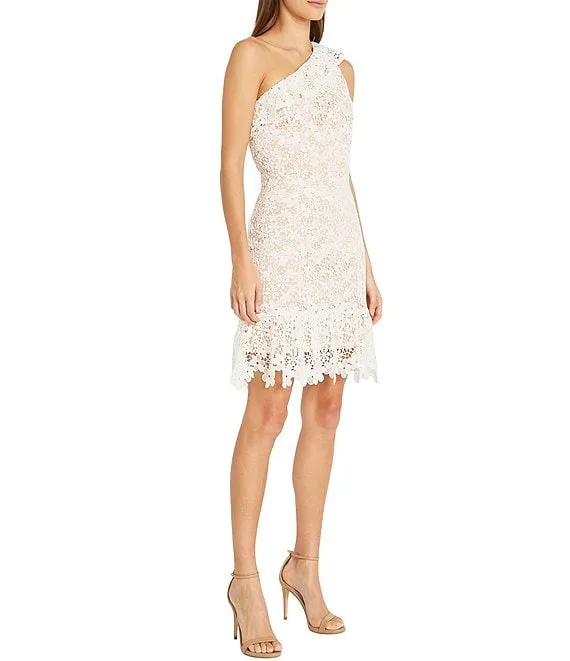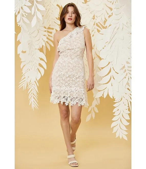 Lace One Shoulder Ruffle Trim Sleeveless Mini Dress