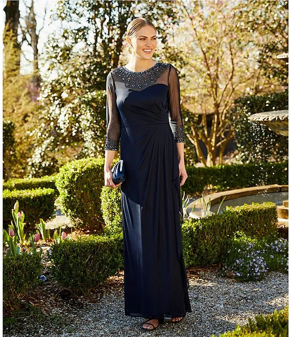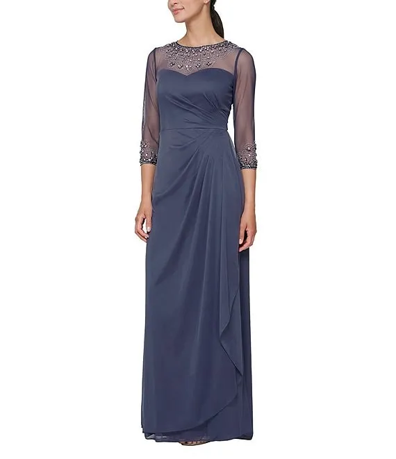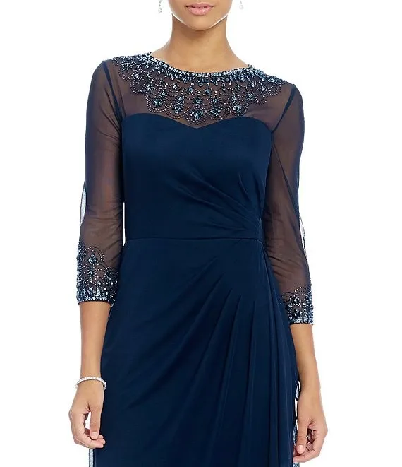 Long Beaded Illusion Sweetheart Neck 3/4 Sleeve Ruched Dress