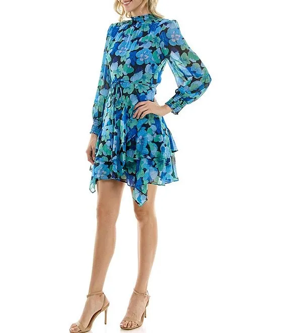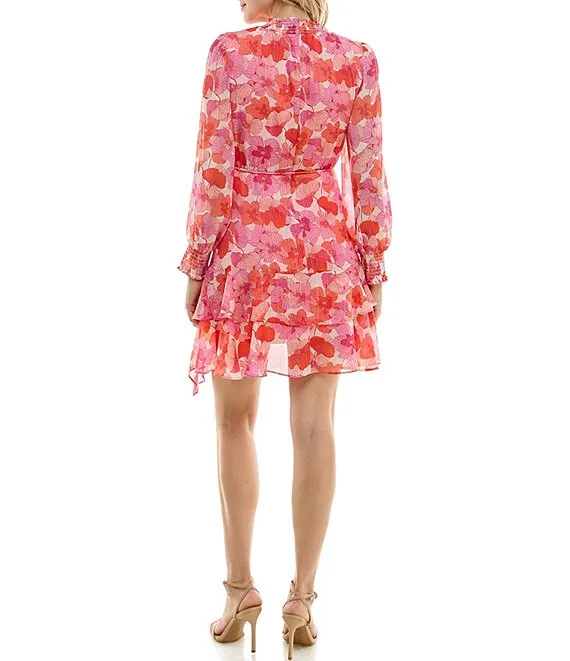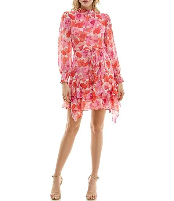Long Sleeve Mock Neck Tiered Ruffle Skirt Tie Waist Floral Dress