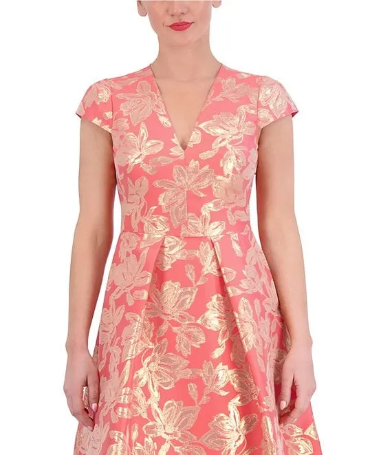 Metallic Jacquard Floral Print V-Neck Cap Sleeve Fit and Flare Pocketed Dress