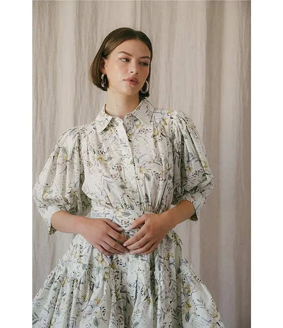 Mindy Floral Print Point Collar Neck 3/4 Puff Sleeve Poplin Mini Shirt Dress
